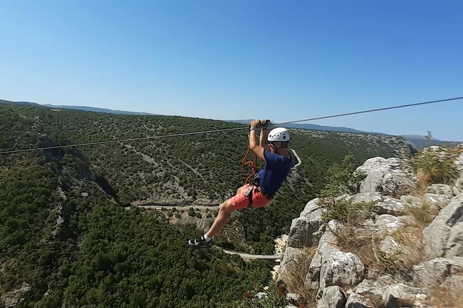 La cascata Roški si trova nella parte superiore del Parco nazionale di Krka. Lo raggiungeremo dopo 20 minuti di trasporto dalla città di Sebenico. Come inizio del nostro tour di un giorno, c'è un'opzione per fare esperienza in zipline che ha tre linee separate lunghe 650, 500 e 250 me alte 120 m. Questa scarica di adrenalina è facoltativa e non inclusa nel prezzo del tour. Puoi scegliere di scendere in coppia o da solo sotto la sorveglianza di guide esperte.
